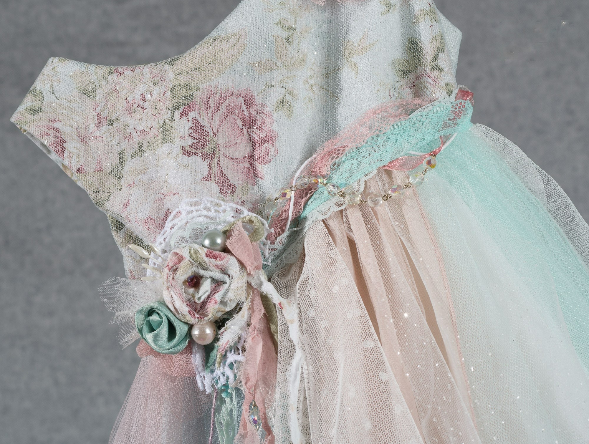 -Φόρεμα (φόδρα από 100% βαμβάκι) εμπριμέ φλοράλ, στολισμένο με χειροποίητα υφασμάτινα λουλούδια και φούστα από λαμπερό τούλι και δαντέλες