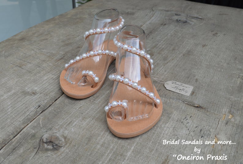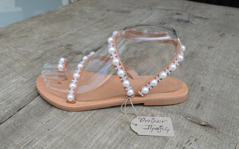 Μοναδικά δερμάτινα σανδάλια διακοσμημένα με λευκές πέρλες και στρας.