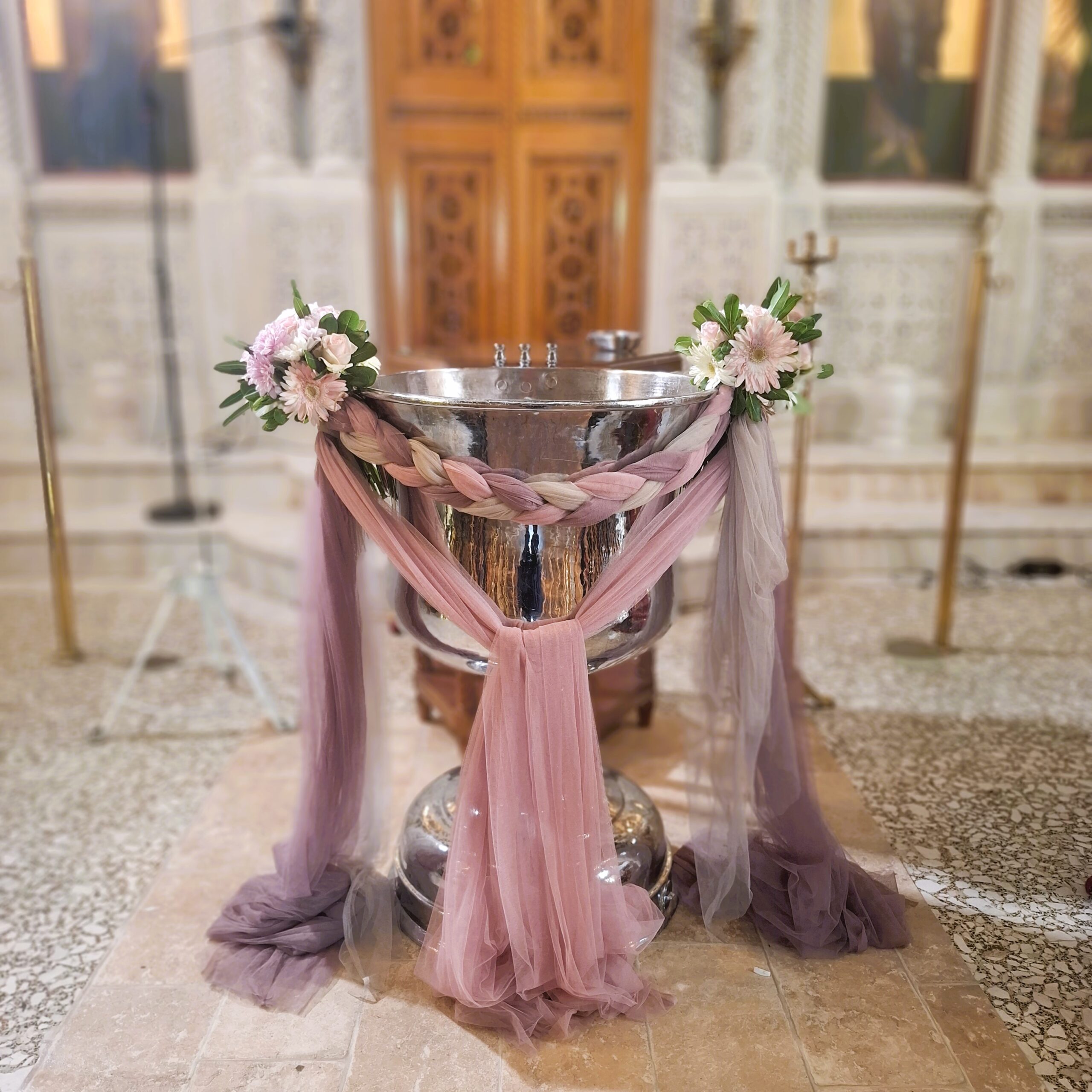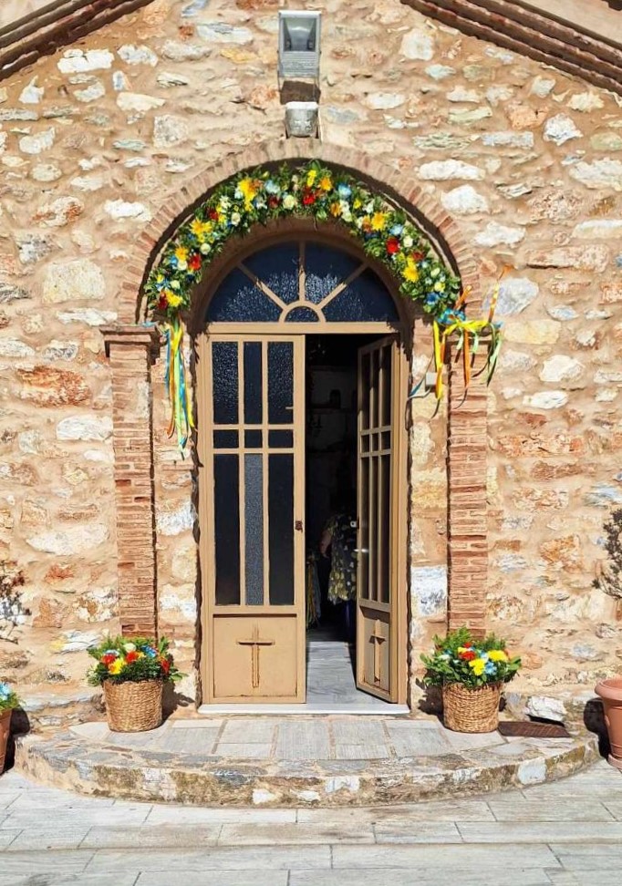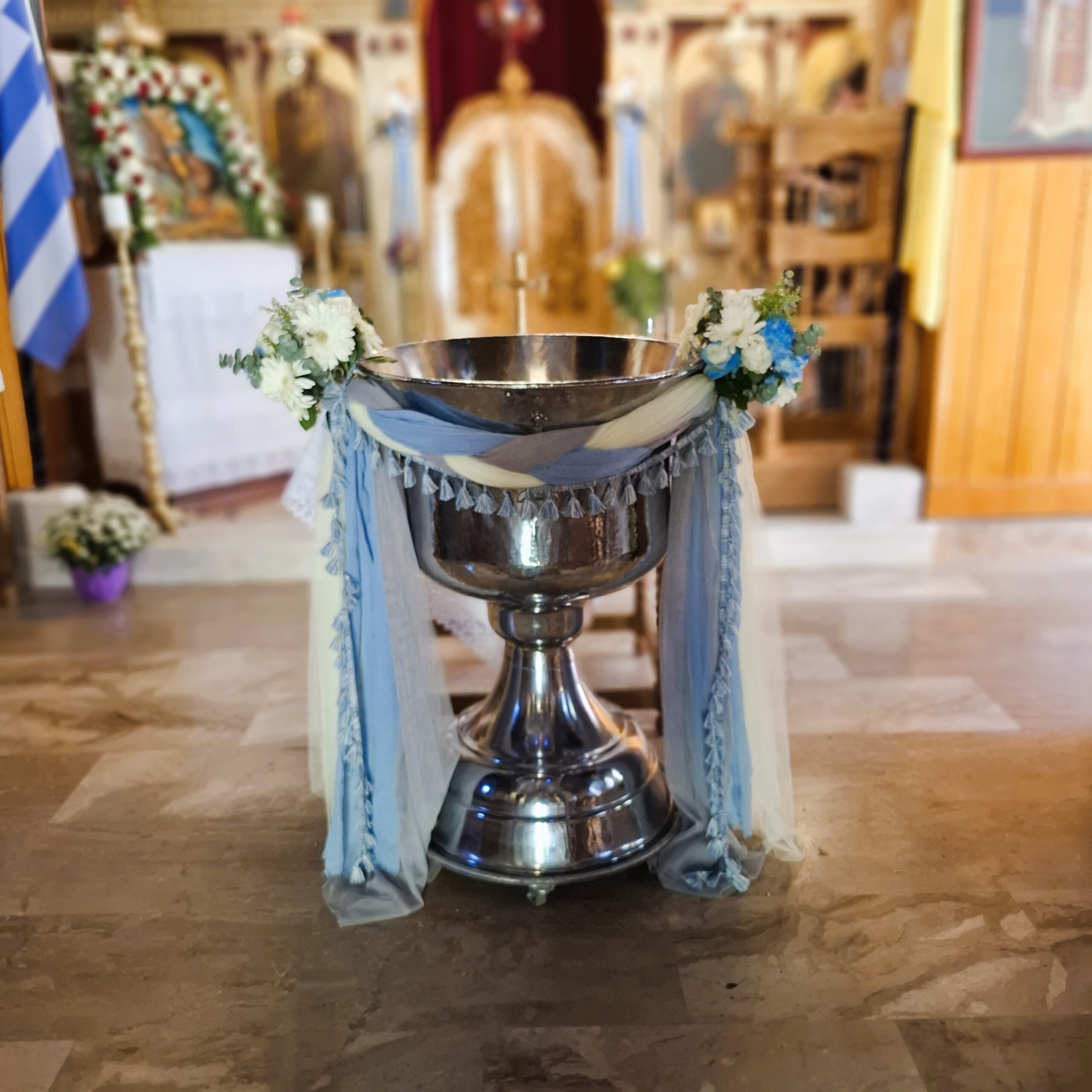 -Εξωτερικός στολισμός εκκλησίας …με υφάσματα, θεματικά στοιχεία, 6 μεγάλα κασπώ με φρέσκα λουλούδια εποχής , ρέπλικες ή vintage στοιχεία σχετικά με το θέμα. Στολισμός στις κολώνες ή στη πόρτα της εκκλησίας με αέρινα υφάσματα και μπουκέτα από φρέσκα λουλούδια εποχής…
