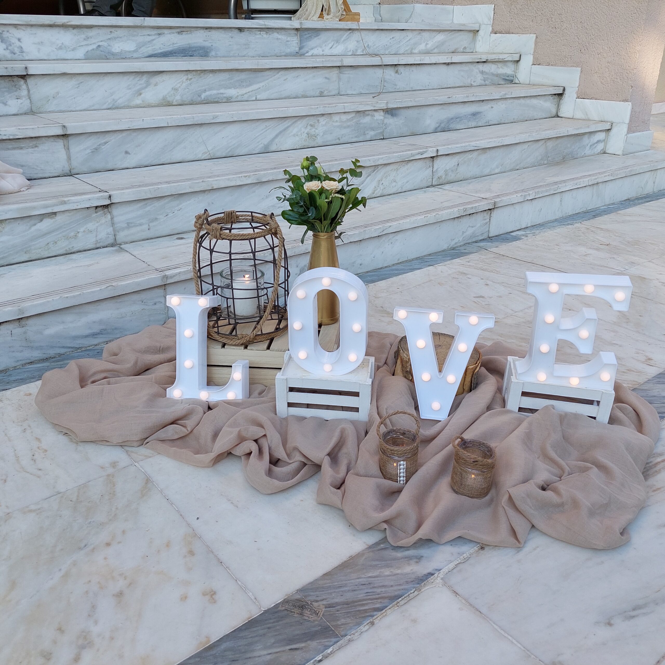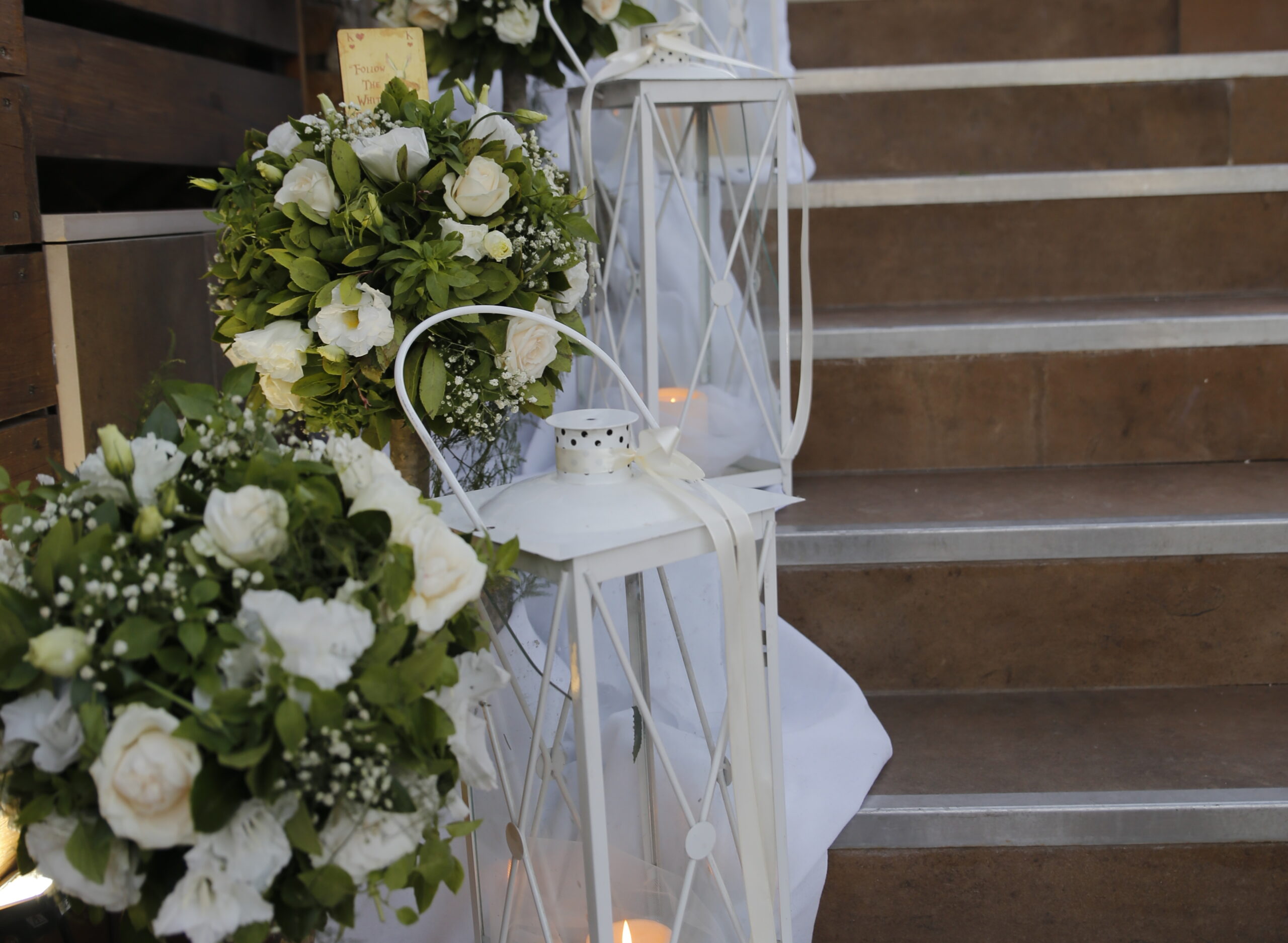 -Στολισμός εισόδου εκκλησίας με αέρινα υφάσματα,6 φανάρια με κερί ,6 συνθέσεις με λουλούδια εποχής επιλογής σας και γυάλα με κερί ή εναλλακτικά 6 ψηλές γυάλες με pampas και 6 χαμηλότερες με κερί. Διάφορα διακοσμητικά στοιχεία γάμου θα μπουν ανάμεσα στο στολισμό
